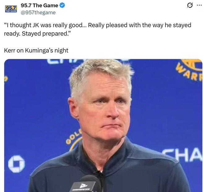 除了科尔之外,追梦赛后也被问到库明加相关问题,他表示:“如果你登场后一直能给对手添麻烦,那你就绝对不会被DNP,库明加一直保持状态,努力训练就是为这一刻准备。”