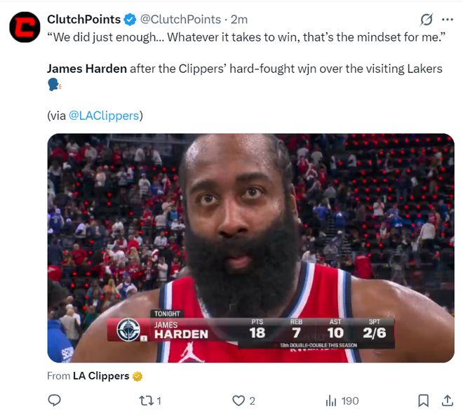 末节哈登先休息让小卡单独带队,哈登登场后命中了一个关键三分,这个三分价值连城,哈登助攻科林斯上篮命中,湖人一度缩小到4分后又被拉开到9分,湖人连丢后场篮板快船再度拉开到10分以上,虽然湖人再度缩小到3分可科林斯命中关键三分,祖巴茨篮下命中锁定胜局。