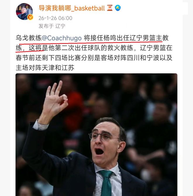 根据篮球媒体人透露,辽宁队已经同意了杨鸣的辞职,与此同时,辽宁队新一任主教练的人选也是正式锁定,他就是辽宁队助理教练乌戈!