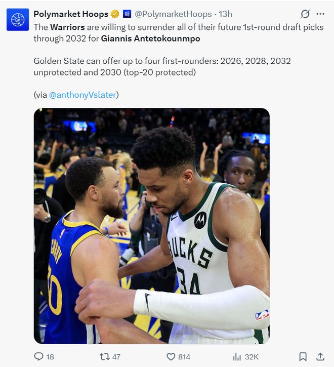 美媒PH透露,勇士队在报价扬尼斯的过程中最多可以送出四个首轮签:2026年、2028年、2032年(三个不保护)、2030年(前20顺位保护)的首轮签。