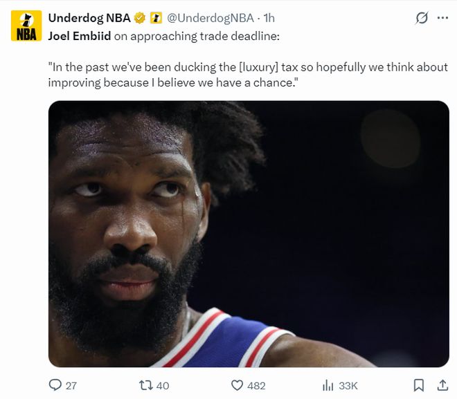 赛后恩比德接受采访谈到交易截止日,大帝说道:过去几个赛季我们一直在避开奢侈税,但这一次我希望球队能有所改变,因为我觉得补强后我们会有机会去冲击我们最大的那个目标。
