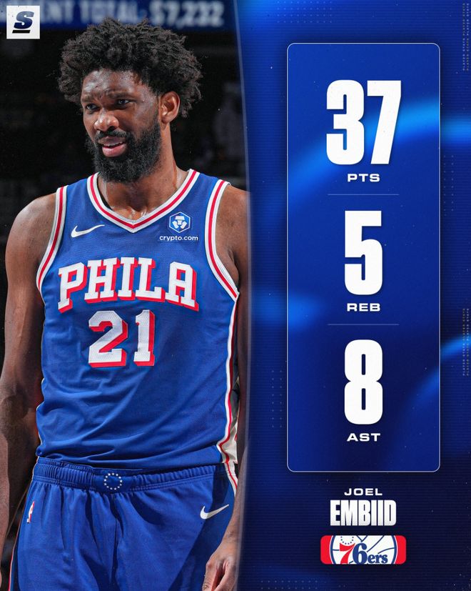 第二功臣当然是大帝,36分钟,21中13,三分2中1,罚球13中10,拿到37分8助攻5篮板1抢断1盖帽,命中率61.9%,三分命中率50%,正负值+9。恩比德近期的个人状态有明显的提升,他真的梦回巅峰了。