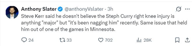 此前因为明尼阿波利斯的暴风雨问题,勇士VS森林狼的比赛延续了一天,实际上库里在抵达明尼阿波利斯之前右膝就已经有不适感,1月24日训练后就已经出现症状,但库里还是带伤打了对阵森林狼的比赛。