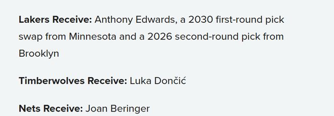 我们开篇就提到了这个方案。说实话,这笔交易对两队而言几乎都是无稽之谈,湖人和俄克拉荷马城雷霆大概率都会直接拒绝。
