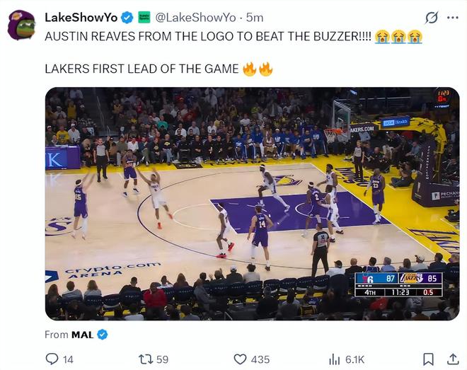 第三节刚开场,里夫斯还剩0.5秒接球完成了一个压哨的超远三分,这是一个不沉球的超远三分,湖人媒体都看哭了。