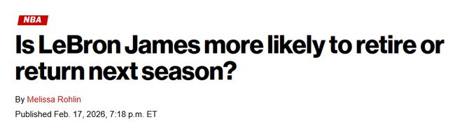 这个可能性很低,因为很难想象詹姆斯会不想要一次告别巡演。而且他仍保持着极高水准,场均22分,投篮命中率50.2%,另有5.8篮板7.1助攻。他依然有能力在任何夜晚成为场上最好的球员。詹姆斯一直说,他会打到“车轮彻底掉下来”为止,而现在他离那一步还远得很。