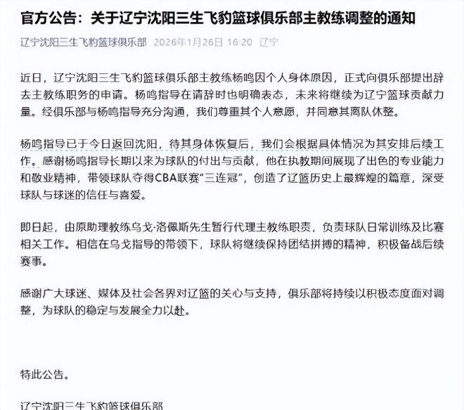 回溯至1月26日,辽宁沈阳三生飞豹篮球俱乐部发布一则官方通告,令无数铁杆拥趸心头一沉:经研究决定,同意主教练杨鸣因健康原因提交的离职请求;助理教练乌戈·洛佩斯即日起代理主帅职责,全面接手球队日常训练与临场指挥工作。