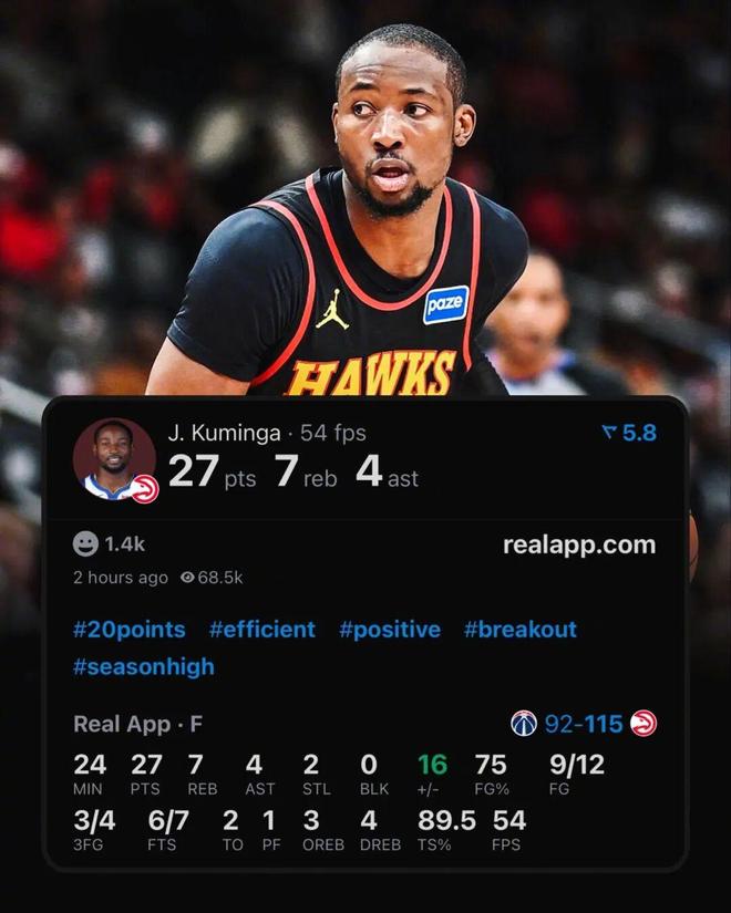 迎来老鹰生涯首秀的库明加表现十分抢眼,替补出战约24分钟,投篮12中9,其中三分4中3,罚球7中6无比高效砍下27分外加7板4助2断全面数据,正负值+16,帮助新东家119-98轻松击败奇才。