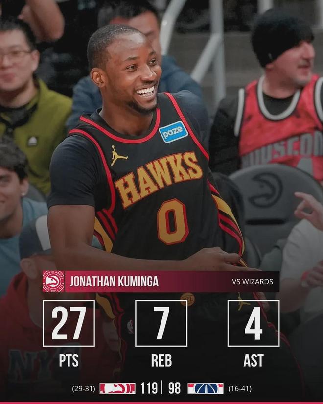 迎来老鹰生涯首秀的库明加表现十分抢眼,替补出战约24分钟,投篮12中9,其中三分4中3,罚球7中6无比高效砍下27分外加7板4助2断全面数据,正负值+16,帮助新东家119-98轻松击败奇才。