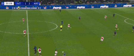 60分钟后,两队都开始换人调整,国米的变化立即收到了效果,埃斯波西托对枪手的防线构成了不小的威胁。第66分钟,埃斯波西托上演了标志性的停球转身射门,皮球稍稍偏出。