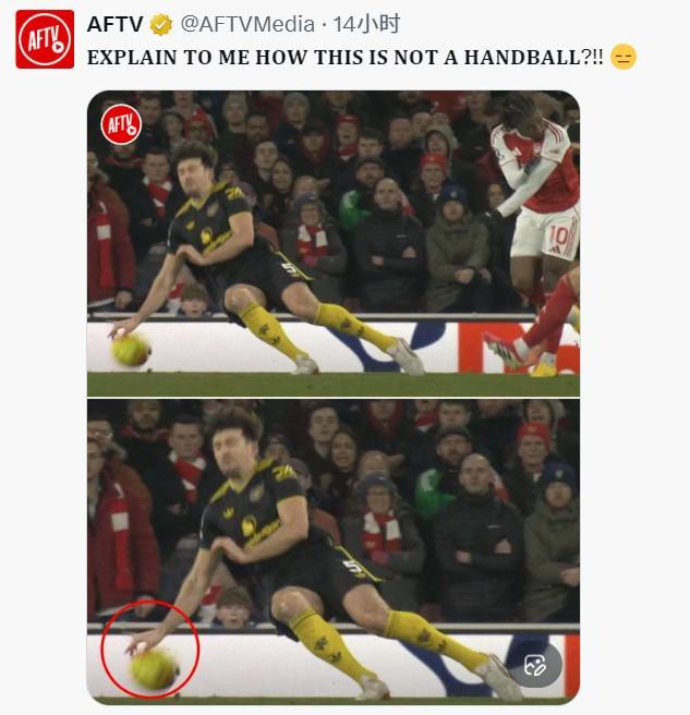 “给我解释一下这怎么就不是手球,”Arsenal Fan TV 在社媒上写道,并配上了球击中马奎尔手臂的定格画面。