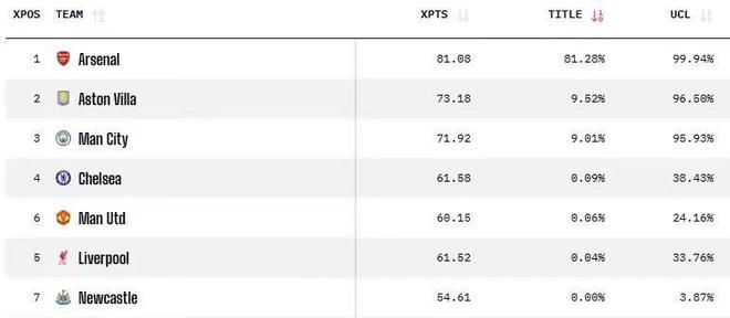 当然,虽然外界对于阿森纳目前的境遇都感到悲观,但毫无疑问AI对于阿森纳本赛季夺冠的前景还是非常看好的,据知名数据网站Opta预测,英超联赛23轮比赛结束后,英超夺冠的概率中,阿森纳依旧以81.28%概率断崖式的排在第一位,而排在第二位的阿斯顿维拉,仅仅只有9.52%的概率,而曼城则只有9.01%的概率。所以,阿森纳球员和球迷真的没必要过于悲观,毕竟目前主动权还在自己手中。