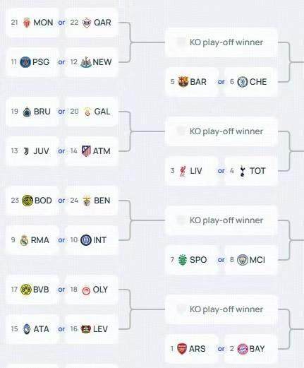 附加赛种子队(9-16名):皇家马德里、国际米兰、巴黎圣日耳曼、纽卡斯尔联、尤文图斯、马德里竞技、亚特兰大、勒沃库森