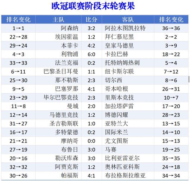 今晨,欧冠联赛阶段第8轮即收官战18场比赛同时打响。在缺少豪门生死悬念的情况下,抢八大戏和附加赛资格争夺仍贡献了有趣的剧情。穆里尼奥领军的本菲卡,依靠门将特鲁宾第98分钟定位球抢点破门,4比2击败皇马,刚好攒够净胜球,力压0比3客场惨败布鲁日的马赛,占据第24名。本菲卡在开局4连败的情况下,最后4轮拿下3胜昂首出线。