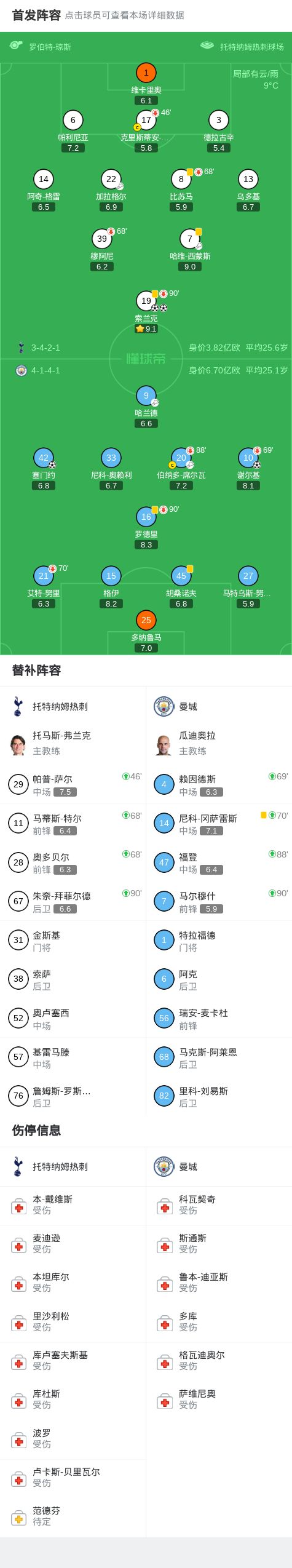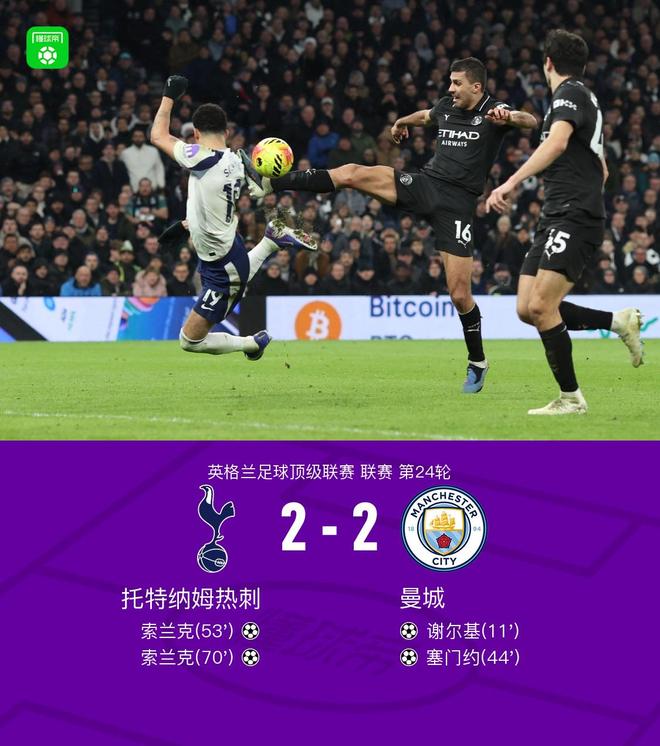 北京时间2月2日0:30,英超第24轮焦点战,托特纳姆热刺坐镇主场迎战曼城,本场主裁判为罗伯特-琼斯。上半场,谢尔基反击突施冷箭首开记录,随后B席助攻塞门约再下一城。下半场,比赛风云突变,索兰克连下两城梅开二度,其中包含一粒蝎子摆尾神仙球。最终,曼城连丢两球2-2热刺。