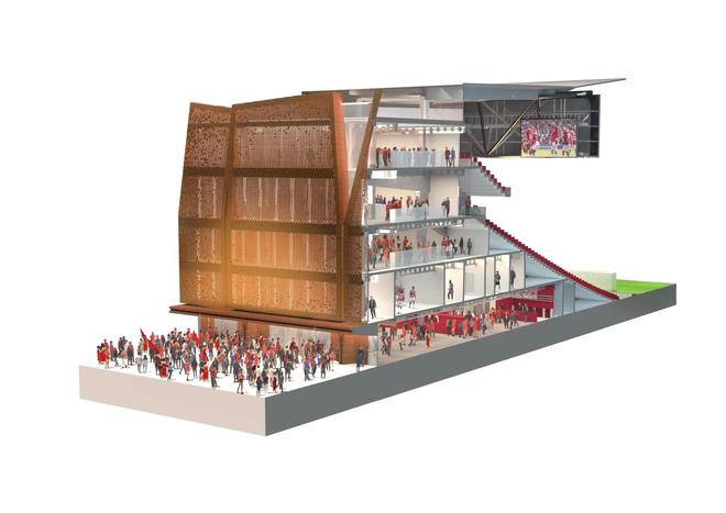 整面玻璃外墙将覆盖醒目的砖石立面,向当地传统产业致敬。雷克瑟姆素有“陶土之城”之称,新看台将使用当地著名的Ruabon红砖,以此体现俱乐部与城市的历史传承。