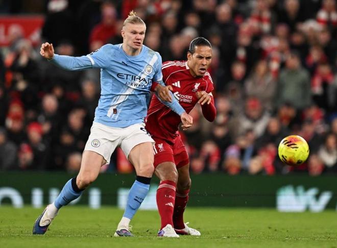 第84分钟,曼城前场组织进攻,谢尔基右路起球吊入禁区,哈兰德奋力头球摆渡,B席斜刺里杀出一脚铲射打穿了阿利松的小门。这是曼城队长本赛季英超首粒进球,但却金子般宝贵。而在伤停补时第3分钟,B席挑传,马特乌斯努内斯突入禁区成功造点。哈兰德顶住压力一脚大力轰门将球打进。曼城2-1反超。而在比赛的最后时刻,索博斯洛伊身为最后一名防守球员犯规被直红罚下,利物浦最终丢了3分又折损大将。