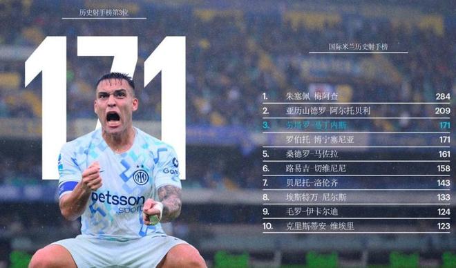 国米队长劳塔罗此役再度有进球入账,这是阿根廷前锋本赛季各项赛事第18球,意甲赛场上第14球,目前继续领跑射手榜。更重要的是,这粒进球是劳塔罗国米生涯第171球,他正式追平传奇射手博宁塞尼亚,并列队史射手榜第三位,排在他身前的只剩梅阿查(284球)和阿尔托贝利(209球)。