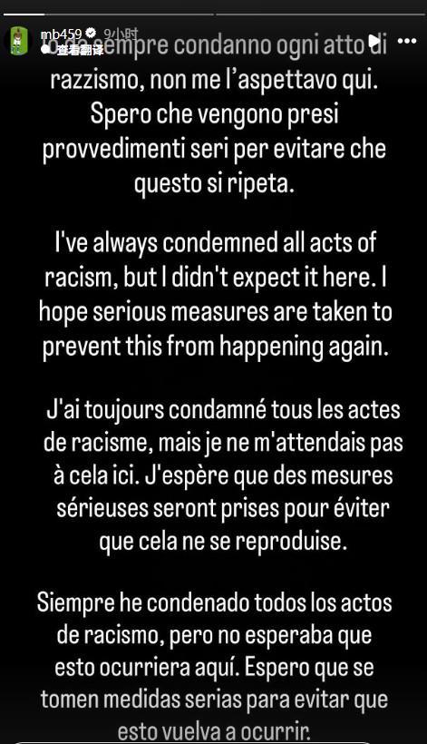 巴洛特利表示,他在对阵迪拜城的比赛中遭遇了种族歧视:“今天,在一场比赛中,我多次成为种族歧视侮辱的对象,有人多次对我说:‘呜呜呜,去吃香蕉吧’。在足球或社会中,绝对没有种族歧视的容身之地。”