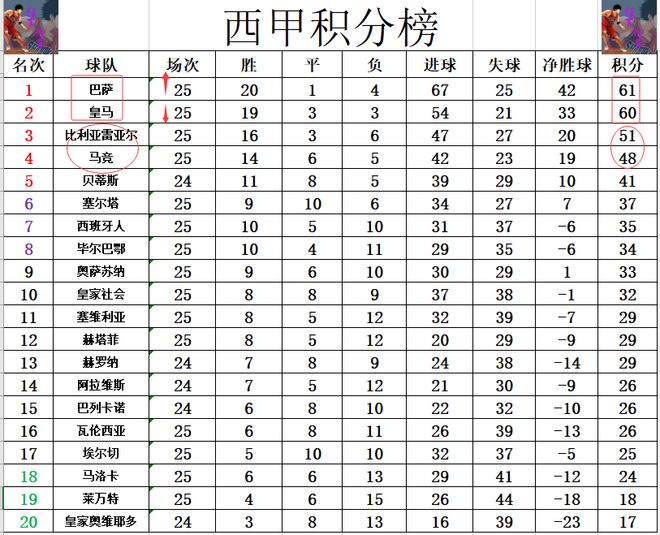 积分榜方面,巴萨今天大胜止住颓势后,皇马就真的只在榜首开心了一周,惨遭榜首一轮游,巴萨1分的优势超过皇马夺回榜首。比利亚雷亚尔今天赢球,多马竞3分,稳住第3的位置。